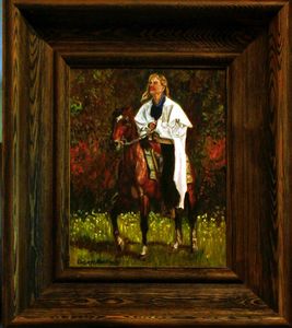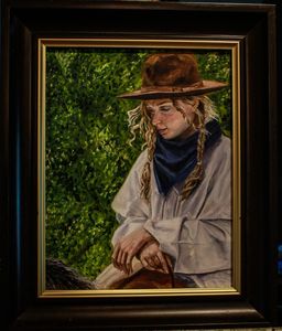 Another Western Art oil Painting. This is the smallest I have ever painted. Quite different. The Evident deep feelings is what drives me to choose what I paint. This young girl is so happy and free spirited that I had a hard time having her pose this way. She always rode a little Hackney with lots of energy. I love the look on her face.